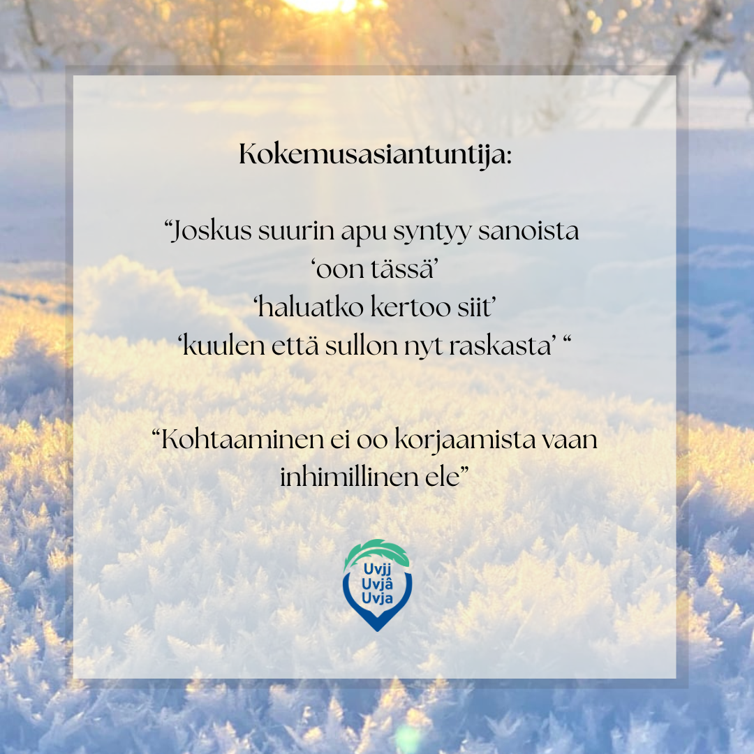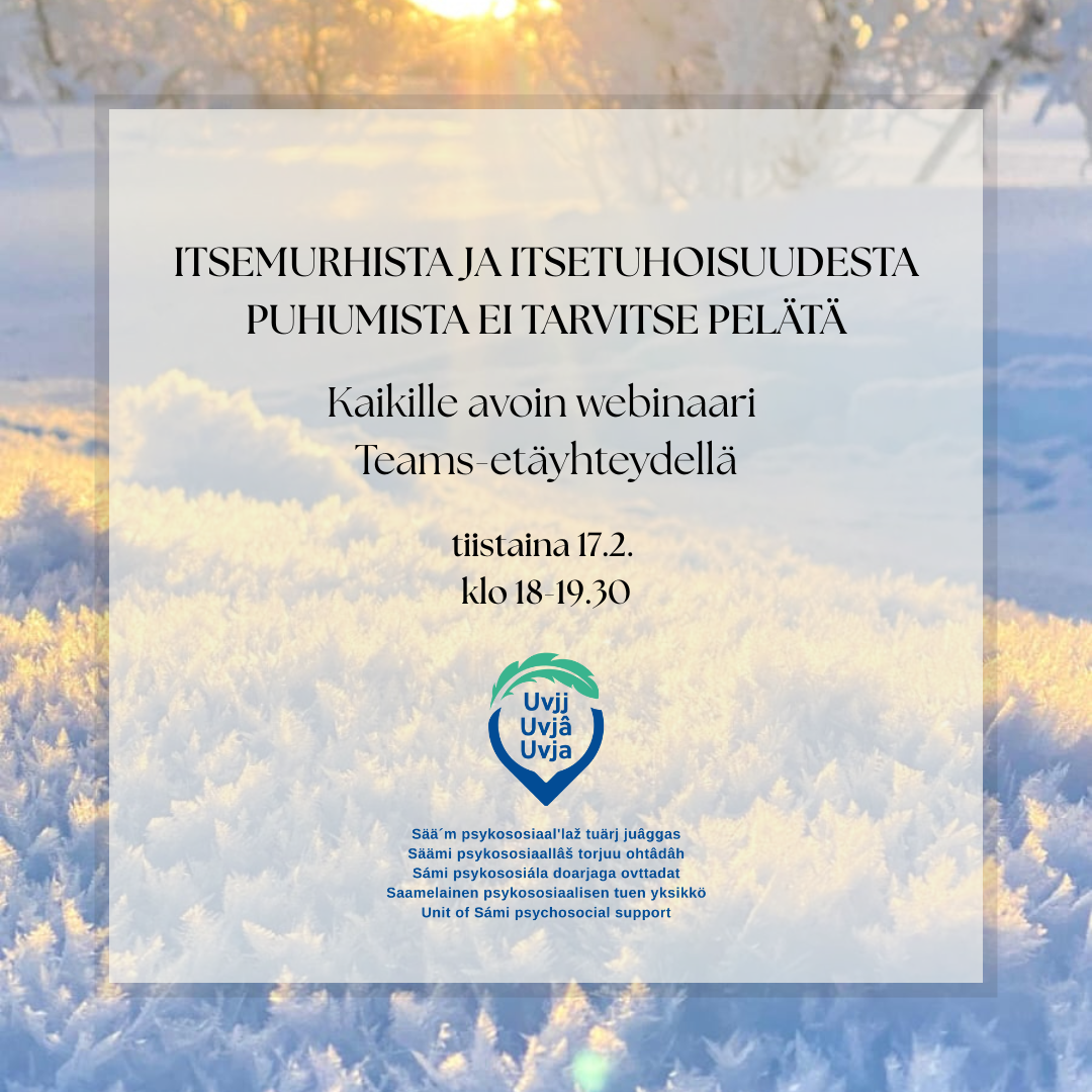 Webinaarin tarkoituksena on tarjota tietoa siitä, miten kohdata itsetuhoinen ihminen ja mistä saada apua itsetuhoisuuteen. Webinaarissa keskustelemme siitä, miten itsemurhat näkyvät saamelaisessa kulttuurissa ja mitä asioita meidän tulisi yhteisönä ottaa huomioon, jotta häpeä ja puhumattomuus itsemurhien ympärillä ei hiljentäisi meitä, vaan osaisimme tukea ja auttaa toisiamme. Webinaarin aikana voi osallistua keskusteluun tai vain seurata ja kuunnella webinaaria. Webinaaria ei tallenneta ja se pidetään suomeksi.