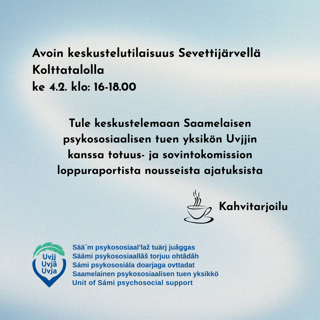 Järjestämme kaikille avoimen keskutelutilaisuuden Kolttatalolla keskiviikkona 4.2. klo 16-18.00. Olet tervetullut keskustelemaan kanssamme totuus- ja sovintokomission loppuraporista nousseista ajatuksista tai muista asioista. Voit myös tulla ihan vaikka vaihtamaan kuulumiset.