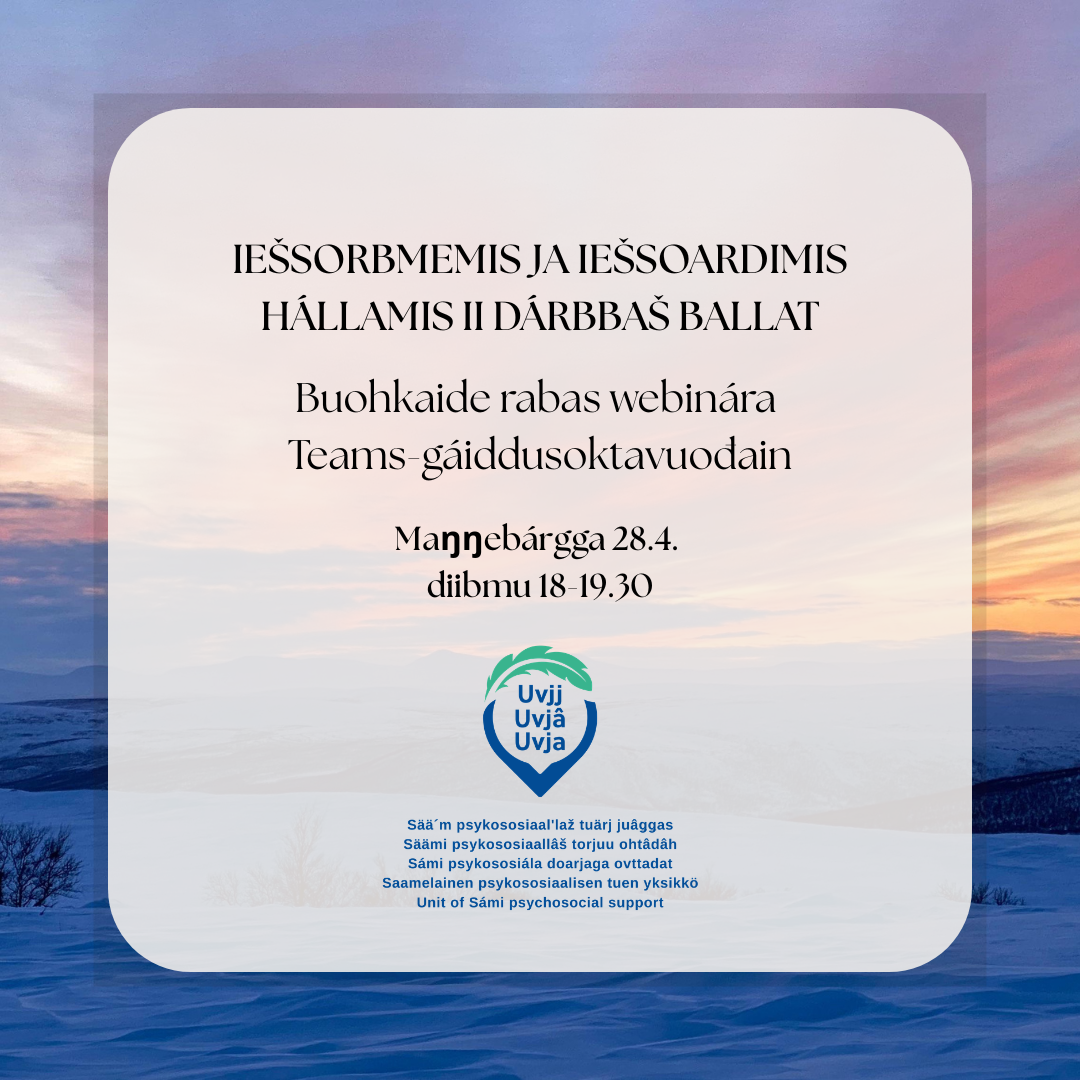 Mii ordniimet guovvamánus webinára iešsorbmemiid ja iešsoardima birra. Hálaimet ovttas vásáhusáššedovdiin mot gulahallat olbmuin geas leat iešsoardinjurdagat ja gos oaččo veahkki iešsoardimii. Ságastalaimet maiddái das mot iešsoardimat oidnojit sámekultuvrras ja maid mii berrešeimmet váldit fuopmášupmái searvvušlaččat vai heahpat ja humuhisvuohta iešsoardimii birra ii jávohuhtášii min, muhto baicca máhttášeimmet doarjut ja veahkehit nubbi nuppi. Vásáhusáššedovdi muitalii iežas vásáhusaid birra ja makkár ássit ja dagut veahkehedje su sevdnjes áigodagaid čađa.